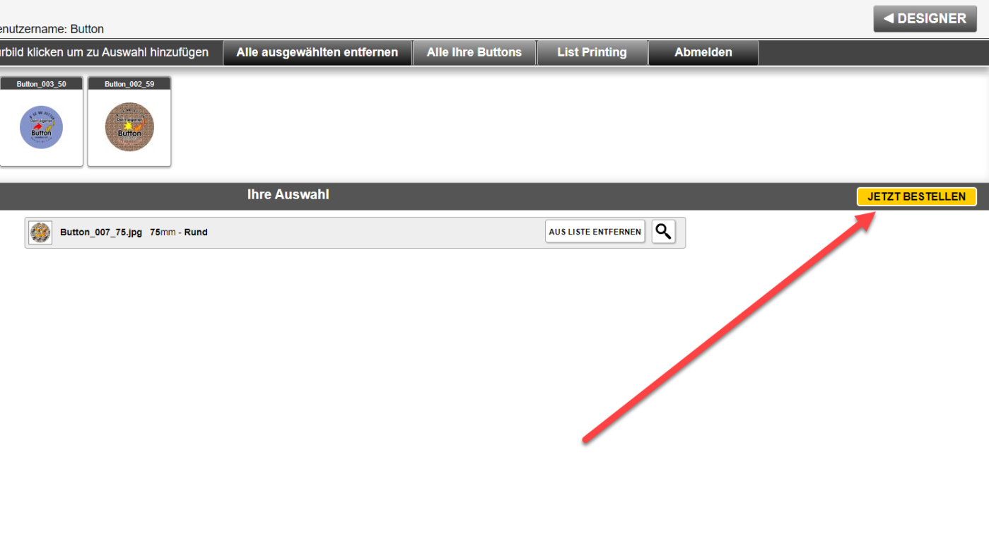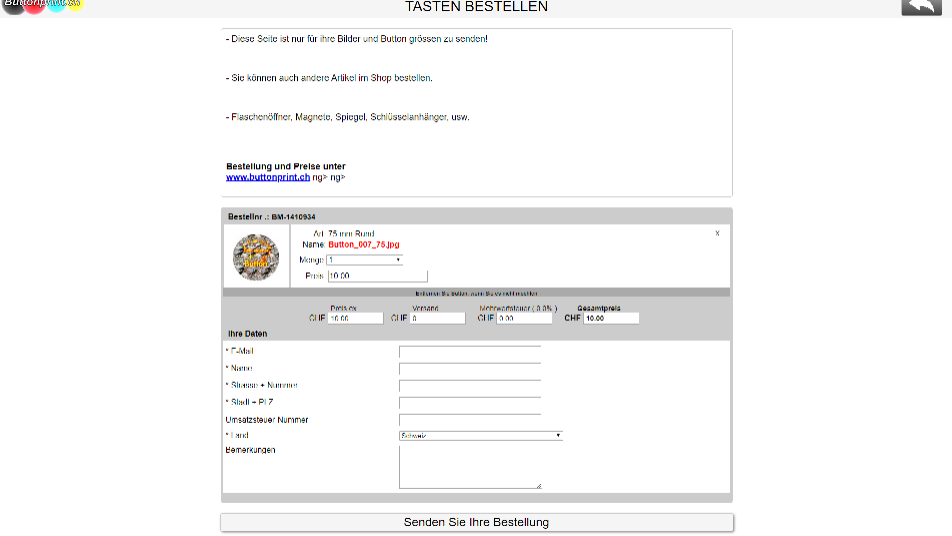 Nach der Übermittlung können sie unter buttonptint.ch ihre Produkte bestellen mit Stückzahl und Preis Angabe